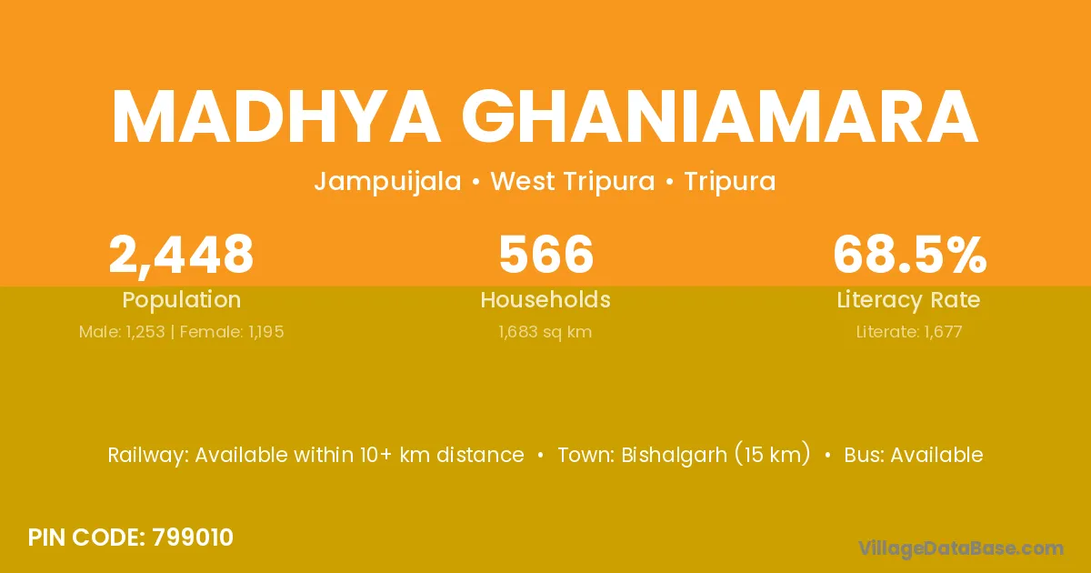 Bishalgarh (15 km) is the nearest town to Madhya Ghaniamara village for major economic activities and is located approximately 15 km away.
