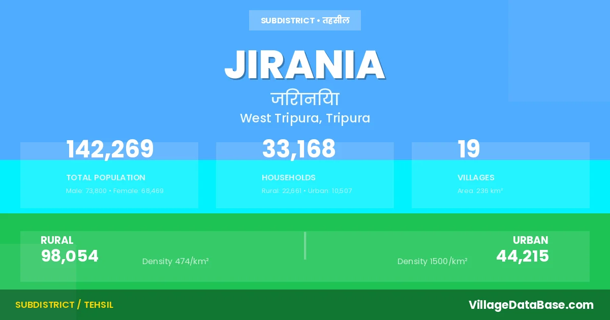 According to the 2011 census The total area of Jirania Subdivision is 236 km², with a population of 142269 people. The population density is 602 inhabitants per square kilometre, and there are approximately 33168 houses in the sub district.