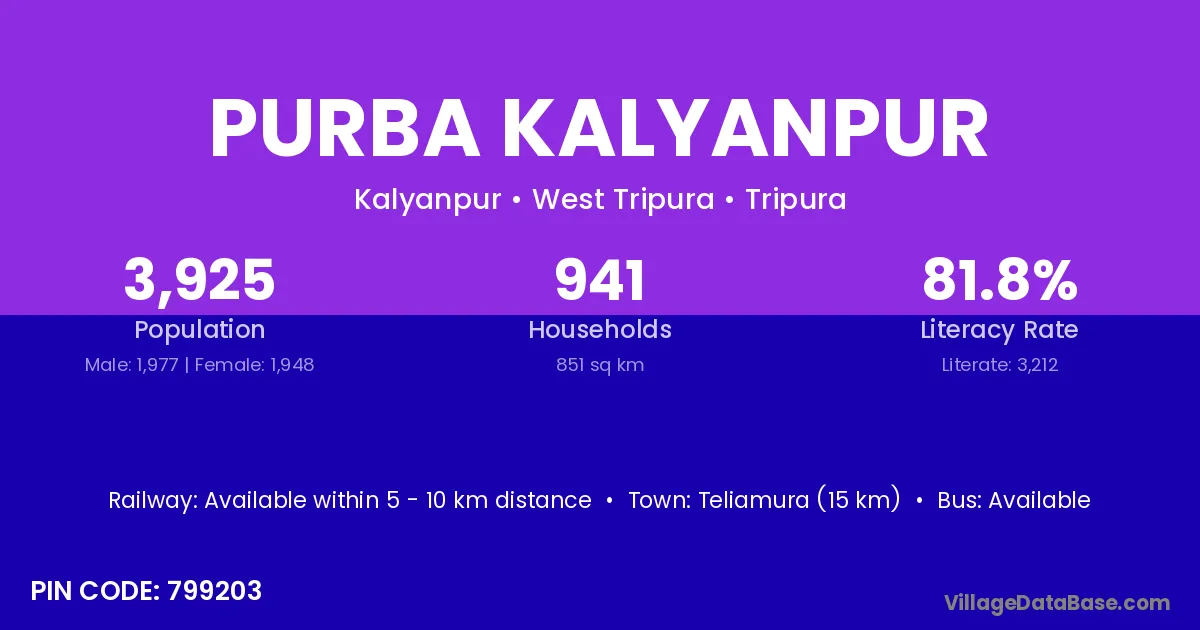 Teliamura (15 km) is the nearest town to Purba Kalyanpur village for major economic activities and is located approximately 15 km away.