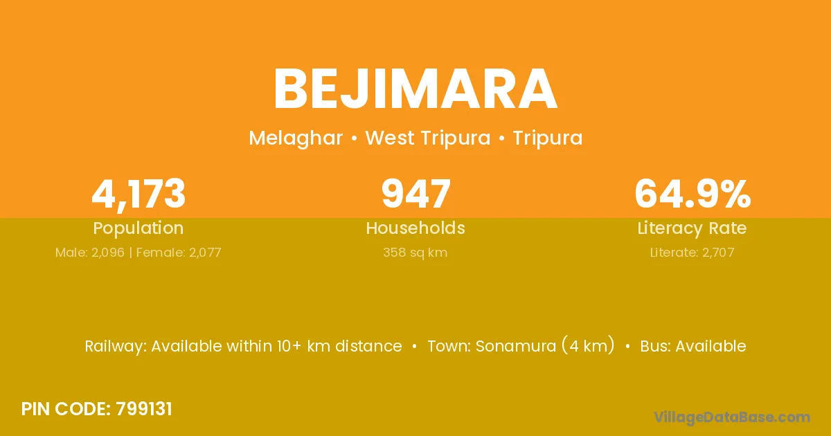 Sonamura (32 km) is the nearest town to Bejimara village for major economic activities and is located approximately 32 km away.