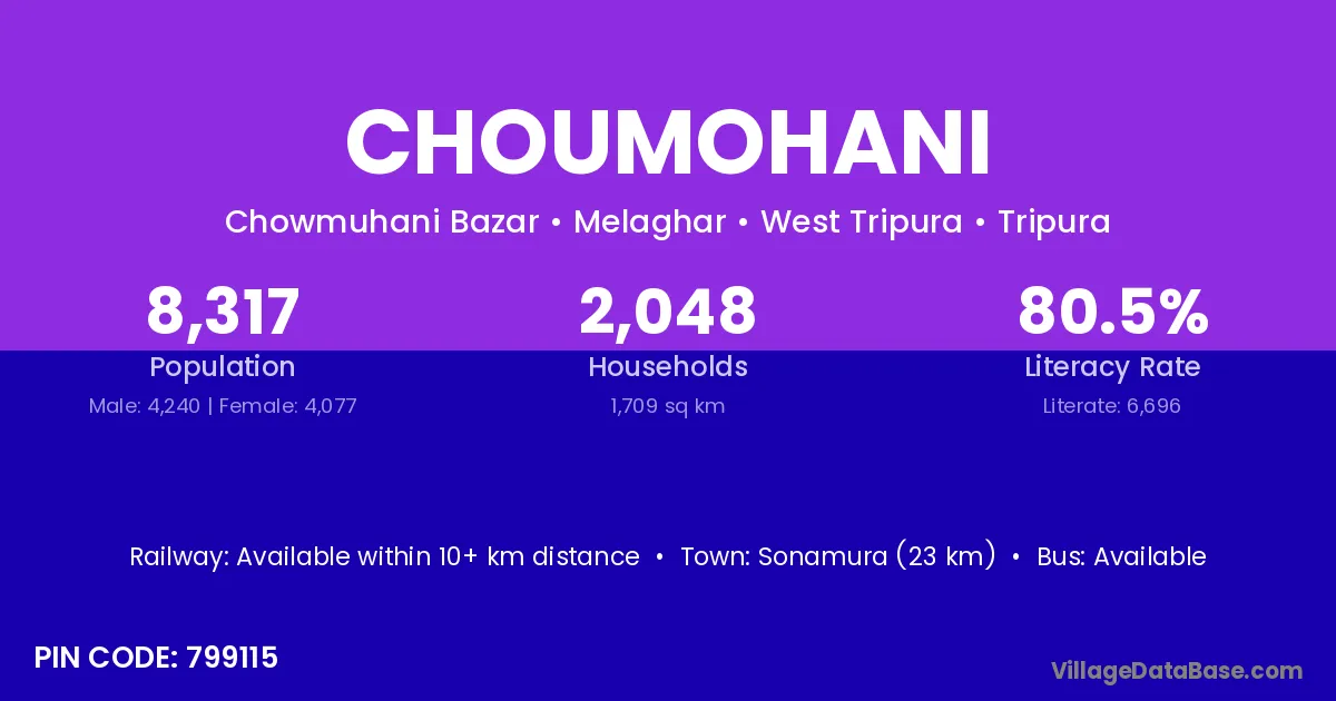 Sonamura (23 km) is the nearest town to Choumohani village for major economic activities and is located approximately 23 km away.