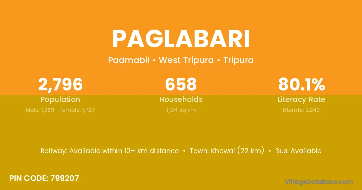 Khowai (22 km) is the nearest town to Paglabari village for major economic activities and is located approximately 22 km away.