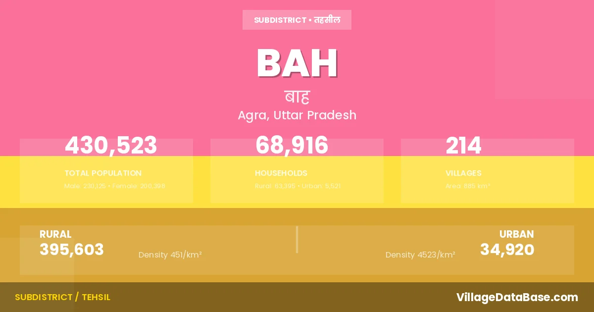 According to the 2011 census The total area of Bah Tehsil is 885 km², with a population of 430523 people. The population density is 487 inhabitants per square kilometre, and there are approximately 68916 houses in the sub district.
