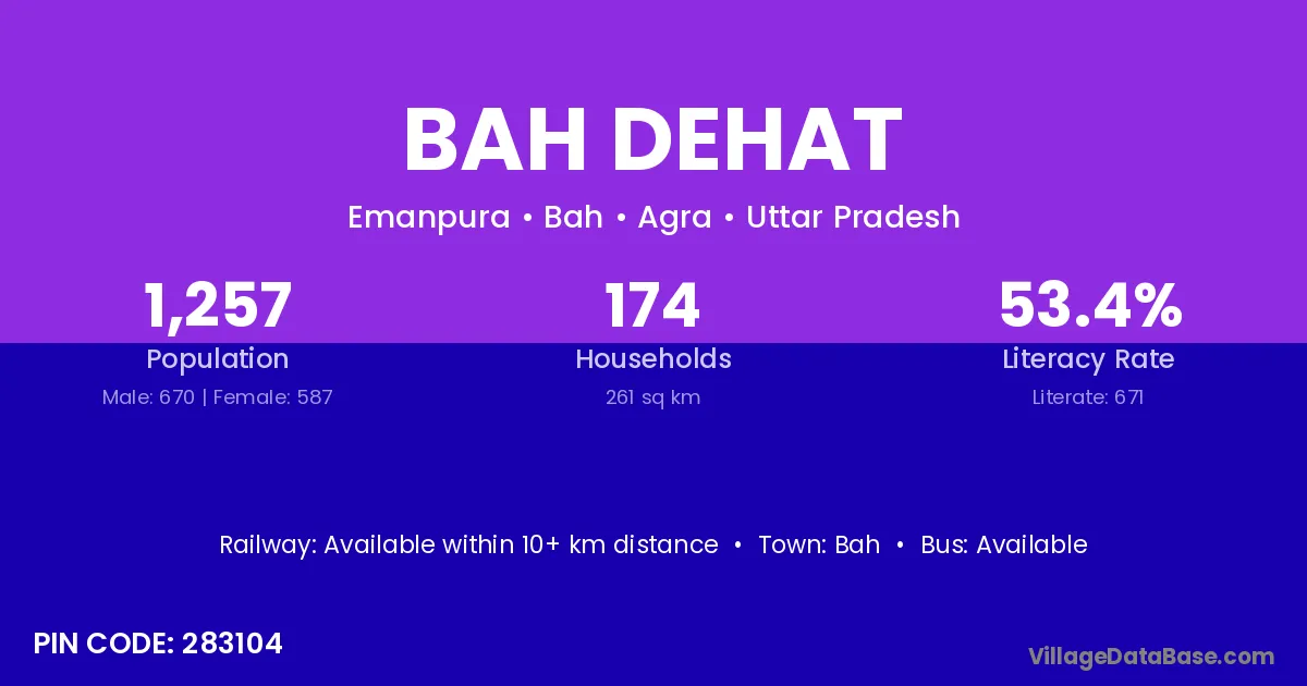 Bah Dehat village is located in the Bah Tehsil of the Agra district in Uttar Pradesh .