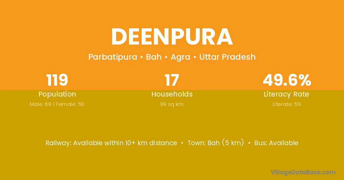 Bah (5 km) is the nearest town to Deenpura village for major economic activities and is located approximately 5 km away.