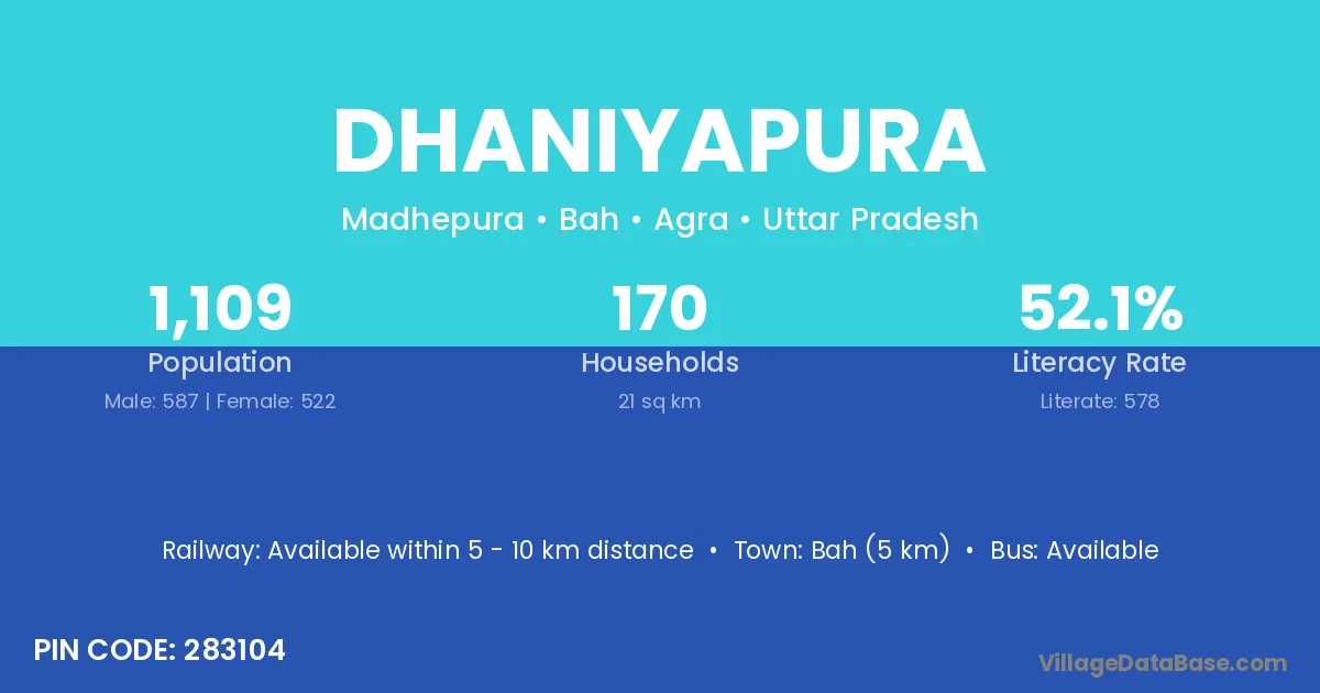 Bah (5 km) is the nearest town to Dhaniyapura village for major economic activities and is located approximately 5 km away.