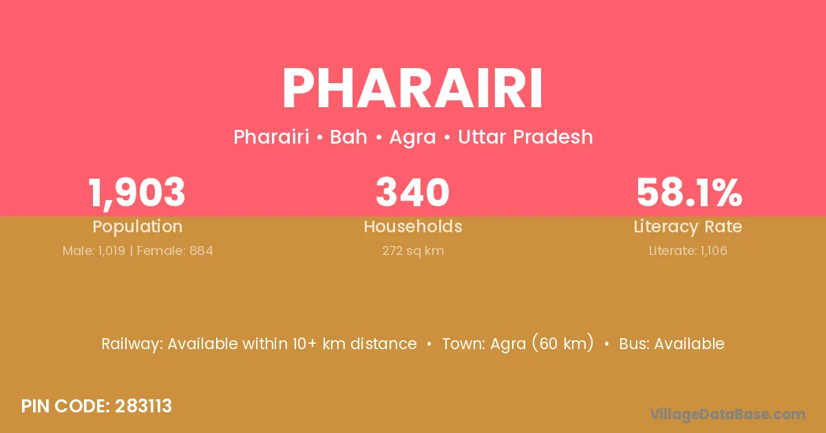 Agra (60 km) is the nearest town to Pharairi village for major economic activities and is located approximately 60 km away.