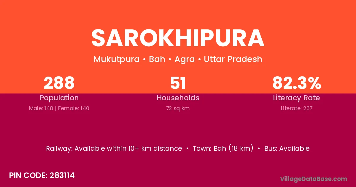 Bah (18 km) is the nearest town to Sarokhipura village for major economic activities and is located approximately 18 km away.