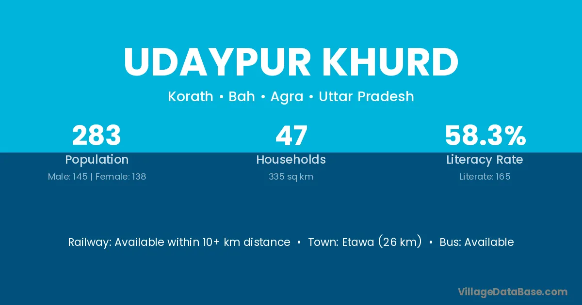 Etawa (26 km) is the nearest town to Udaypur Khurd village for major economic activities and is located approximately 26 km away.