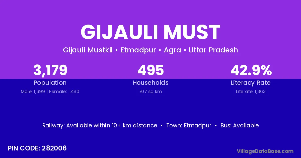 Etmadpur is the nearest town to Gijauli Must village for major economic activities