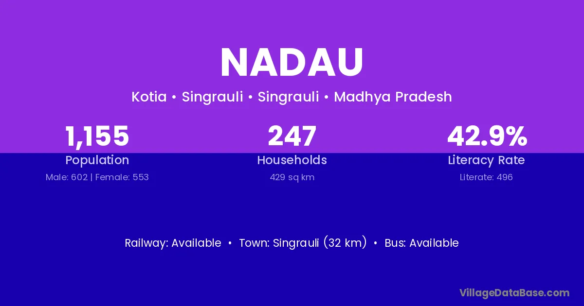 The literacy rate of Nadau village is 57.37%. Male literacy stands at 66.92% and female literacy at 46.18%.