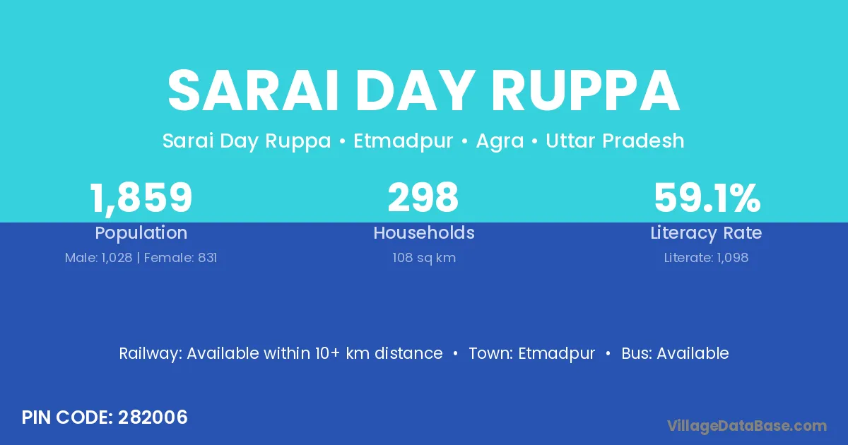 Sarai Day Ruppa village has a total population of 1,859 people, of which 1,028 are males and 831 are females.