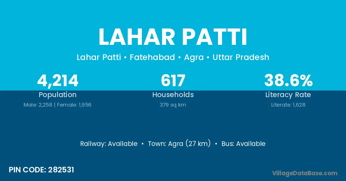 Agra (27 km) is the nearest town to Lahar Patti village for major economic activities and is located approximately 27 km away.
