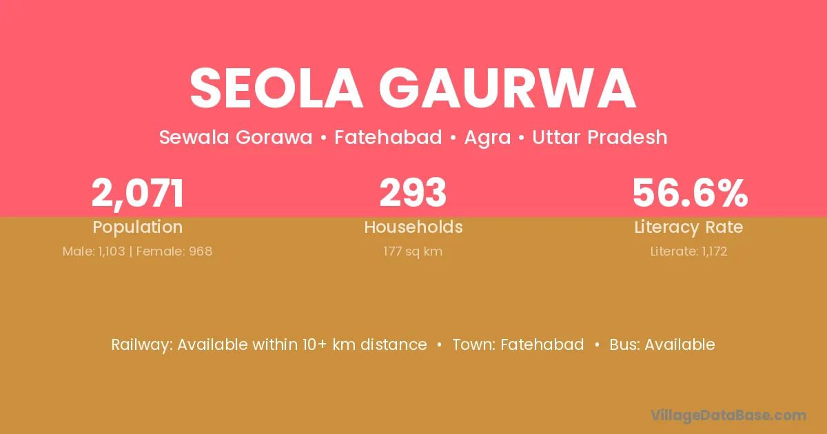 Seola Gaurwa village has a total population of 2,071 people, of which 1,103 are males and 968 are females.