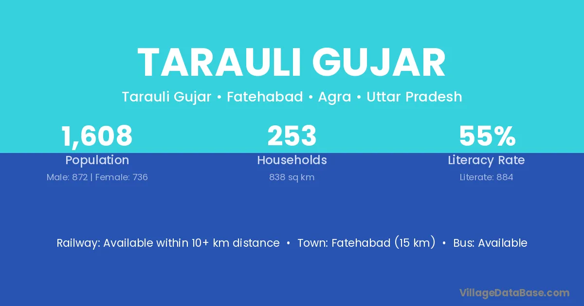 Fatehabad (15 km) is the nearest town to Tarauli Gujar village for major economic activities and is located approximately 15 km away.