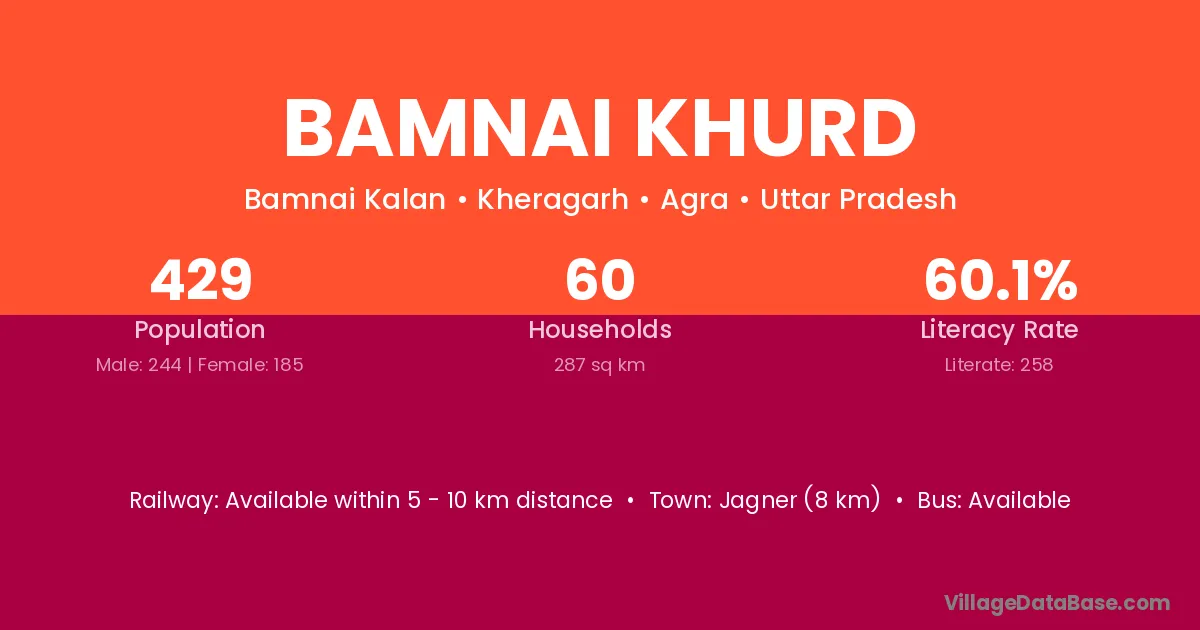 Jagner (8 km) is the nearest town to Bamnai Khurd village for major economic activities and is located approximately 8 km away.