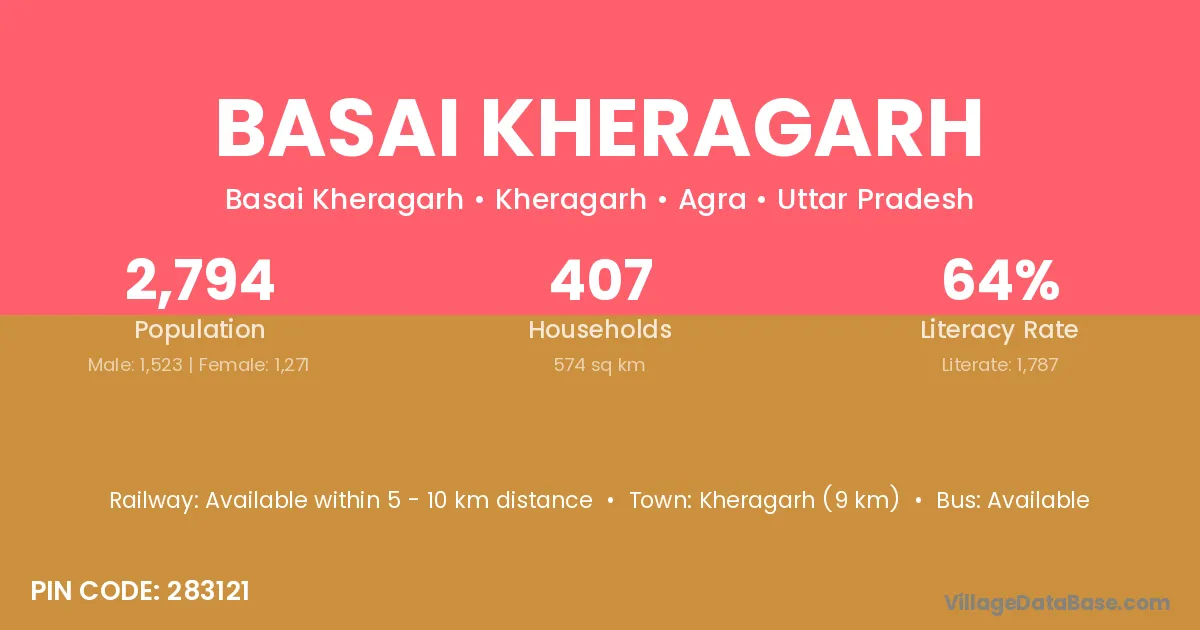 Kheragarh (9 km) is the nearest town to Basai Kheragarh village for major economic activities and is located approximately 9 km away.