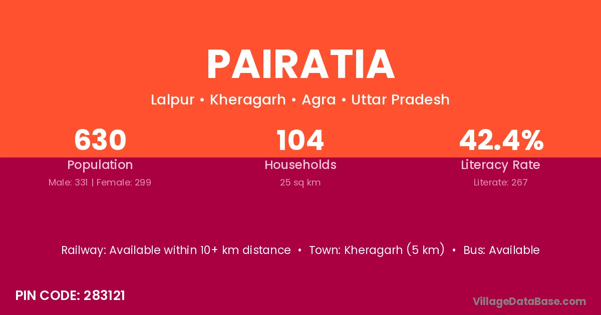Kheragarh (5 km) is the nearest town to Pairatia village for major economic activities and is located approximately 5 km away.