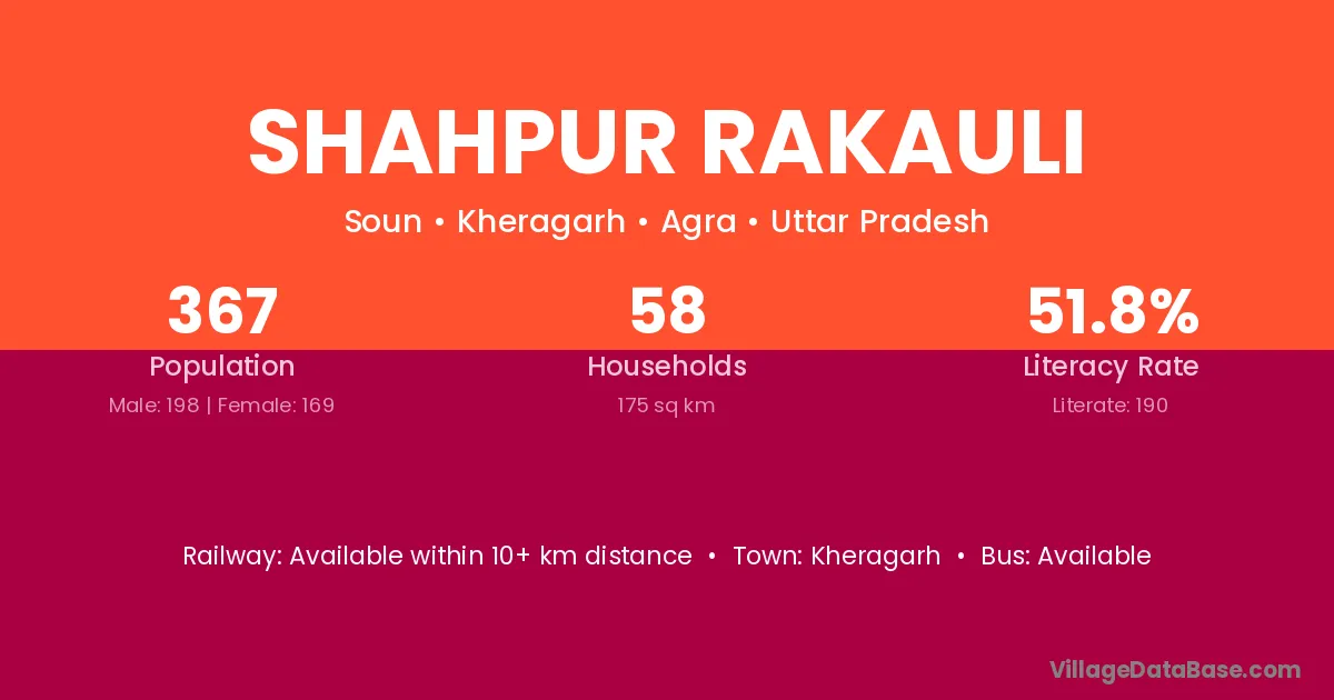Shahpur Rakauli village has a total population of 367 people, of which 198 are males and 169 are females.