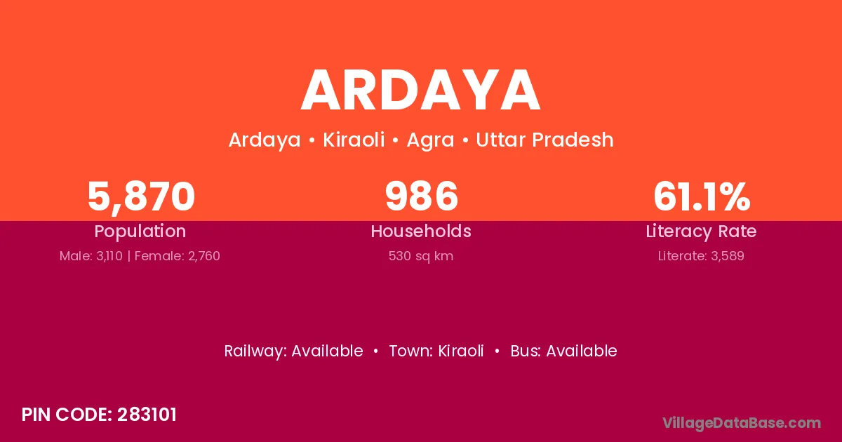 Ardaya village is located in the Kiraoli Tehsil of the Agra district in Uttar Pradesh .
