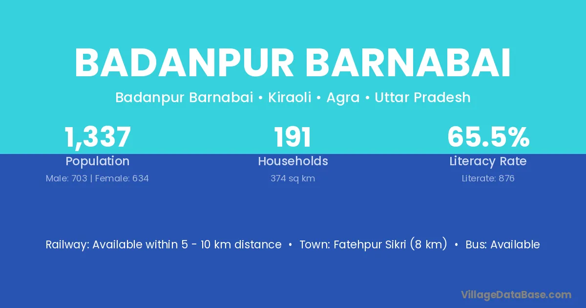 Fatehpur Sikri (8 km) is the nearest town to Badanpur Barnabai village for major economic activities and is located approximately 8 km away.