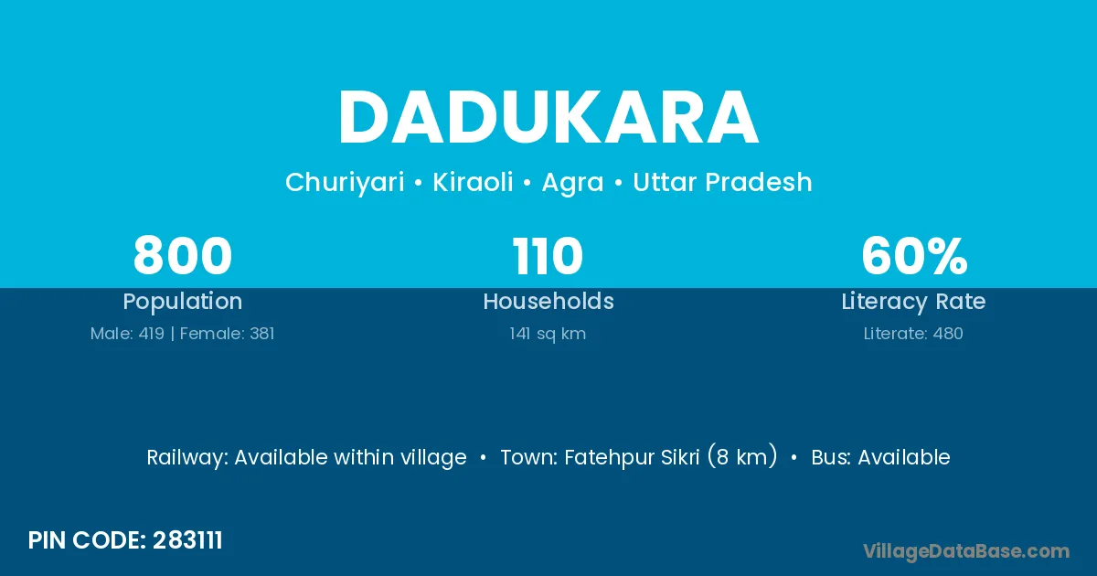 Fatehpur Sikri (8 km) is the nearest town to Dadukara village for major economic activities and is located approximately 8 km away.