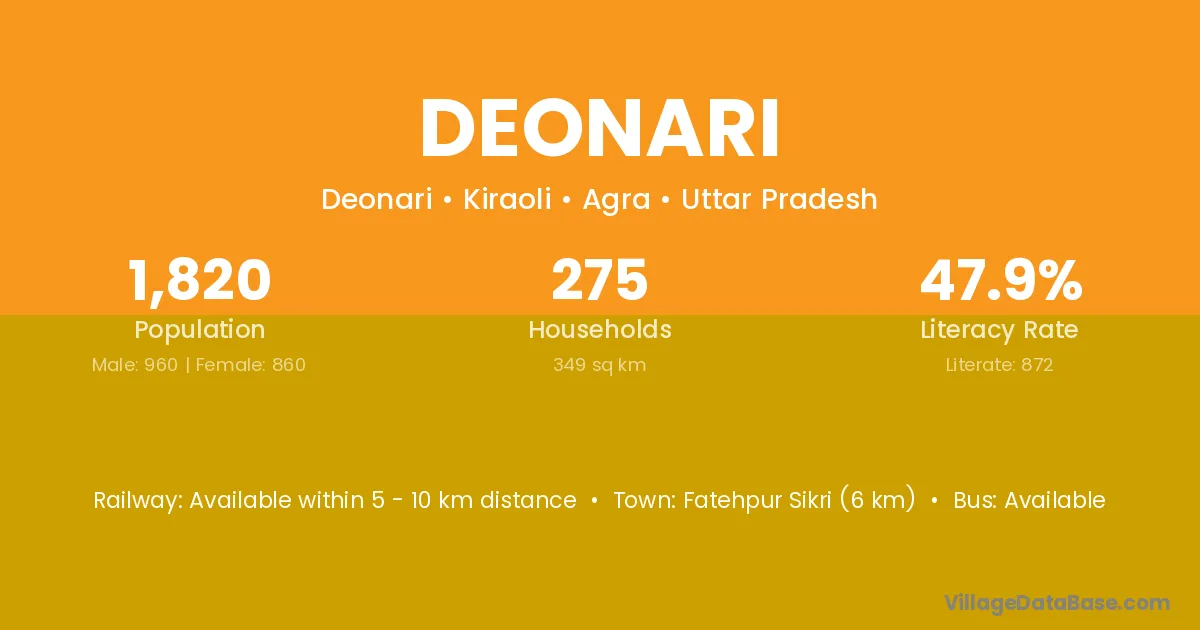 Fatehpur Sikri (6 km) is the nearest town to Deonari village for major economic activities and is located approximately 6 km away.