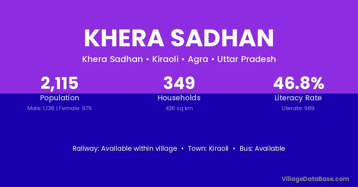Khera Sadhan village has a total population of 2,115 people, of which 1,136 are males and 979 are females.