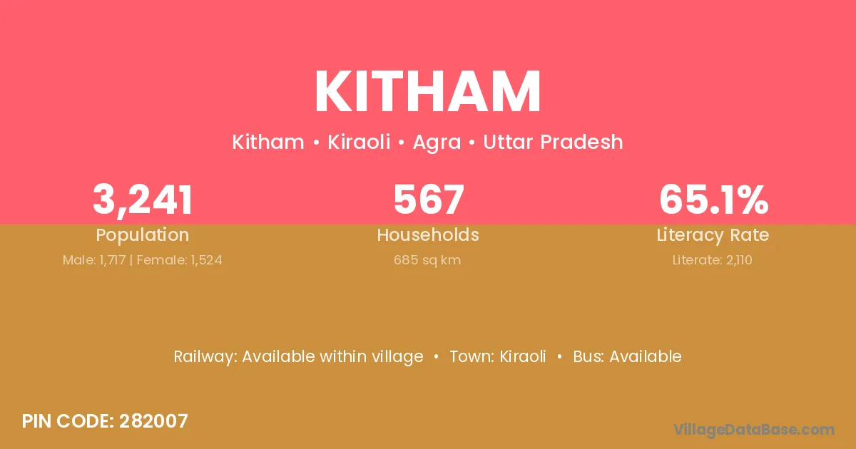 Kitham village is located in the Kiraoli Tehsil of the Agra district in Uttar Pradesh .