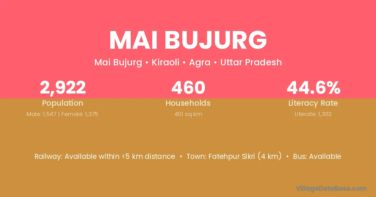 Fatehpur Sikri (4 km) is the nearest town to Mai Bujurg village for major economic activities and is located approximately 4 km away.