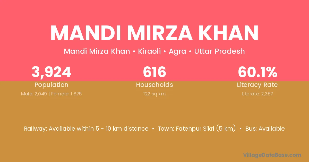 Fatehpur Sikri (5 km) is the nearest town to Mandi Mirza Khan village for major economic activities and is located approximately 5 km away.