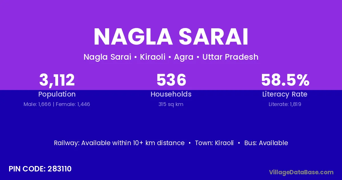 Nagla Sarai village has a total population of 3,112 people, of which 1,666 are males and 1,446 are females.