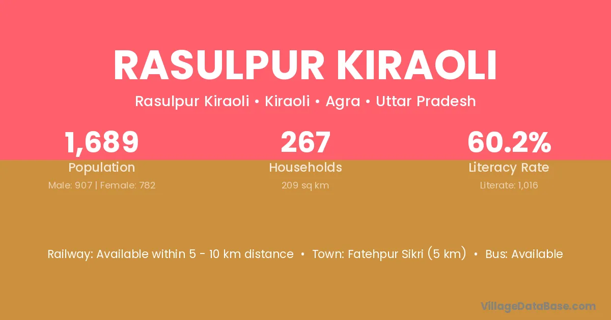 Fatehpur Sikri (5 km) is the nearest town to Rasulpur Kiraoli village for major economic activities and is located approximately 5 km away.