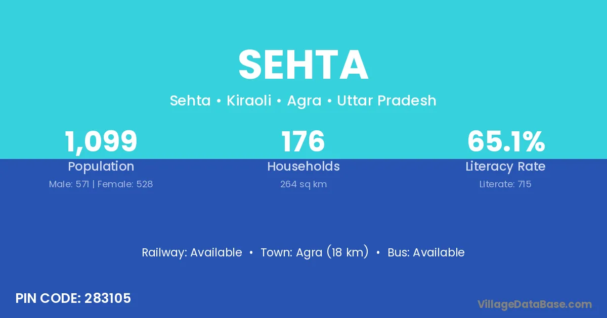 Agra (18 km) is the nearest town to Sehta village for major economic activities and is located approximately 18 km away.