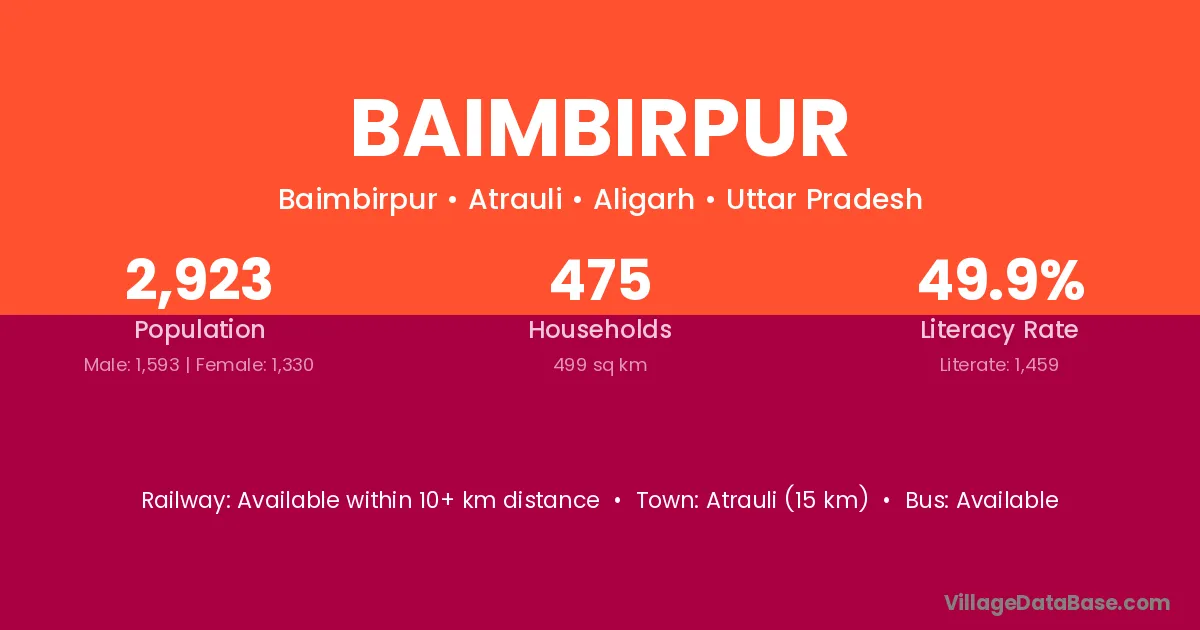 Atrauli (15 km) is the nearest town to Baimbirpur village for major economic activities and is located approximately 15 km away.