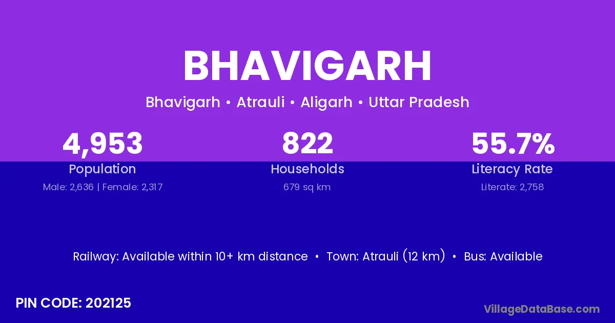 Atrauli (12 km) is the nearest town to Bhavigarh village for major economic activities and is located approximately 12 km away.