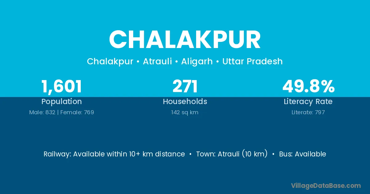 Atrauli (10 km) is the nearest town to Chalakpur village for major economic activities and is located approximately 10 km away.