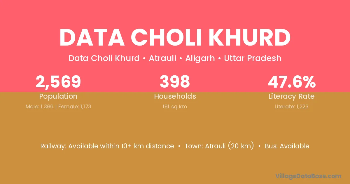 Atrauli (20 km) is the nearest town to Data Choli Khurd village for major economic activities and is located approximately 20 km away.