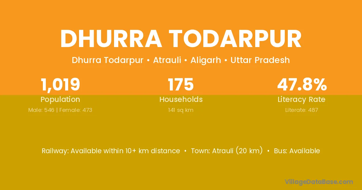 Atrauli (20 km) is the nearest town to Dhurra Todarpur village for major economic activities and is located approximately 20 km away.
