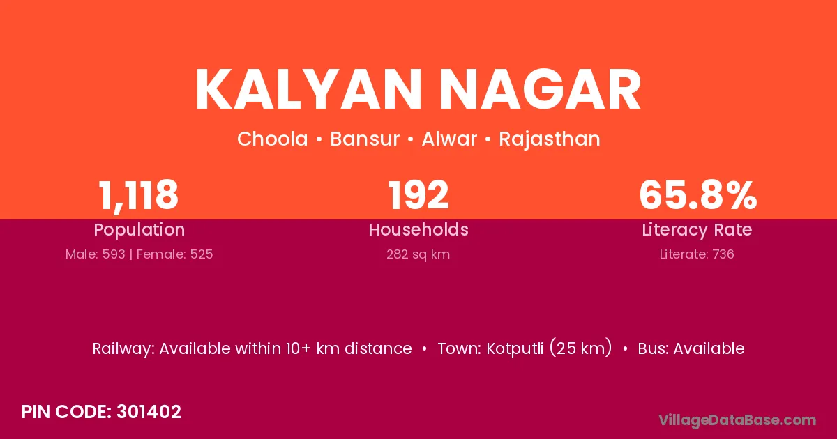 Kalyan Nagar village has a total population of 1,301 people, of which 692 are males and 609 are females.