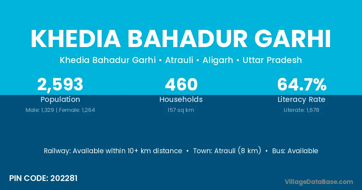 Atrauli (8 km) is the nearest town to Khedia Bahadur Garhi village for major economic activities and is located approximately 8 km away.