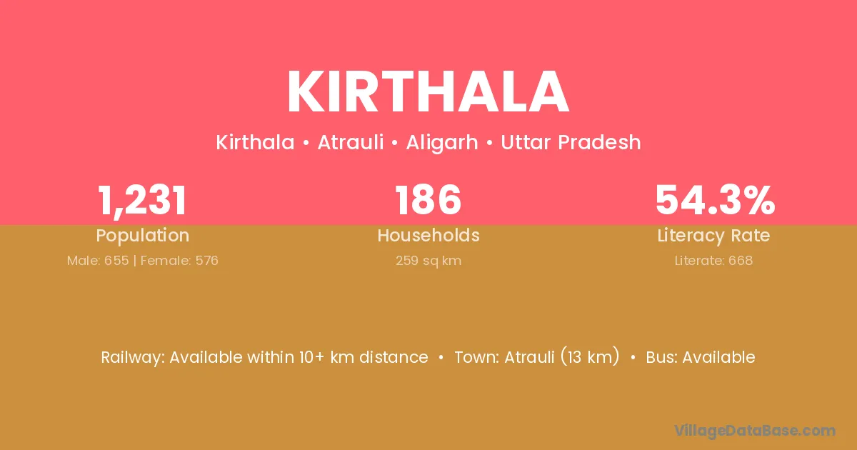 Kirthala village has a total population of 1,231 people, of which 655 are males and 576 are females.