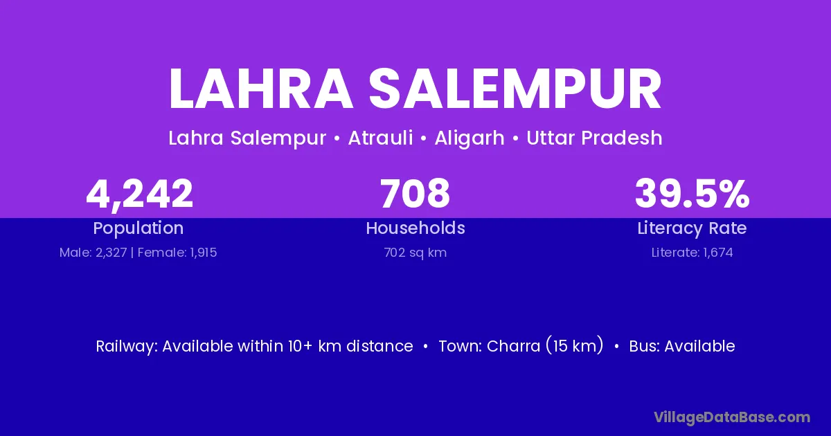Charra (15 km) is the nearest town to Lahra Salempur village for major economic activities and is located approximately 15 km away.