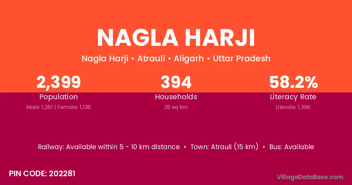 Atrauli (15 km) is the nearest town to Nagla Harji village for major economic activities and is located approximately 15 km away.