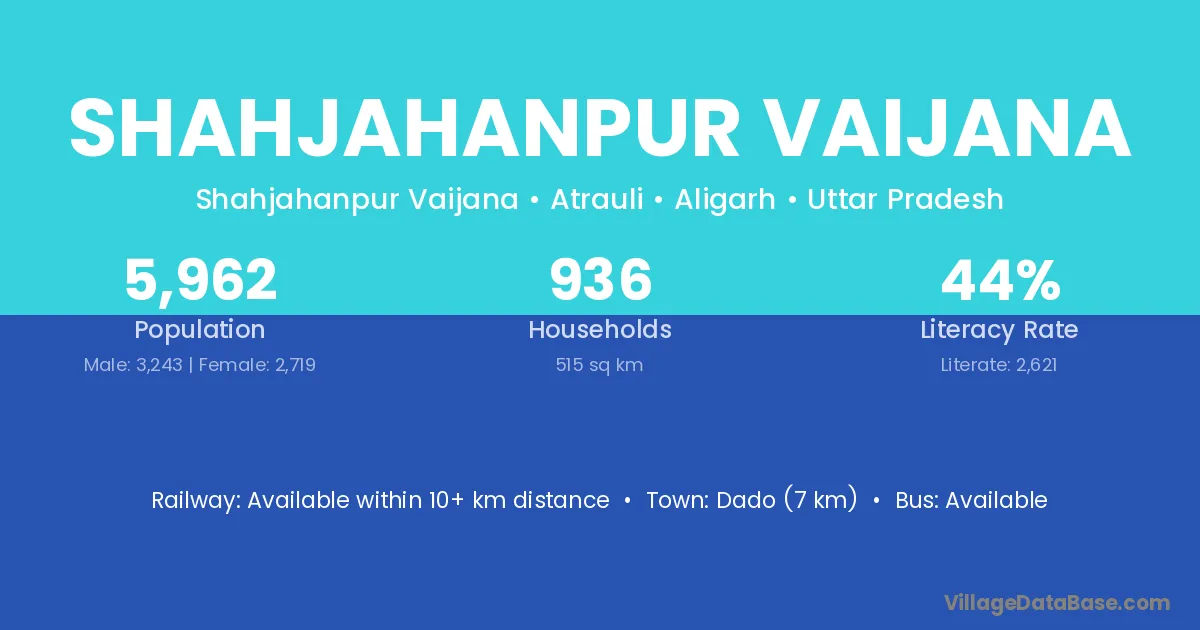 Dado (7 km) is the nearest town to Shahjahanpur Vaijana village for major economic activities and is located approximately 7 km away.