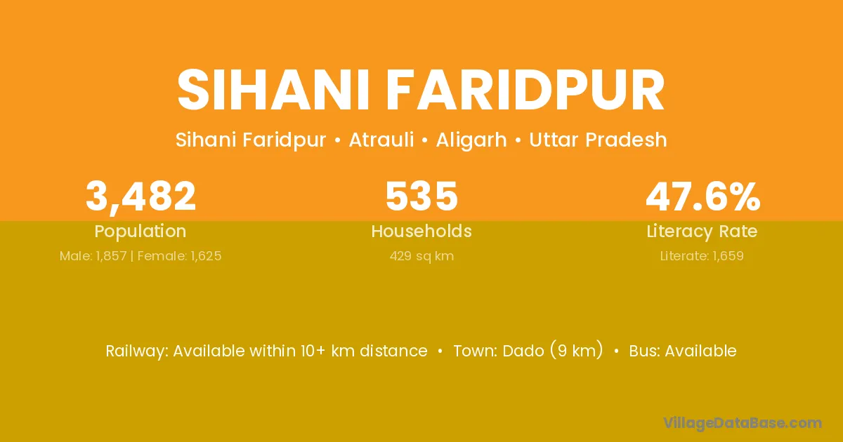 Dado (9 km) is the nearest town to Sihani Faridpur village for major economic activities and is located approximately 9 km away.