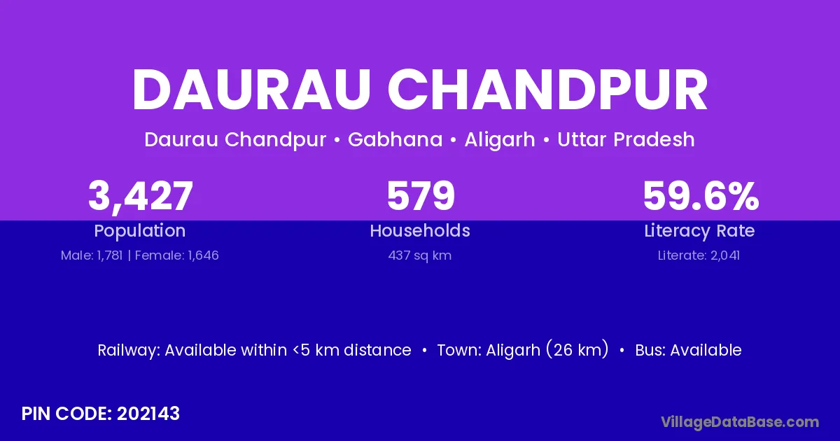 Aligarh (26 km) is the nearest town to Daurau Chandpur village for major economic activities and is located approximately 26 km away.