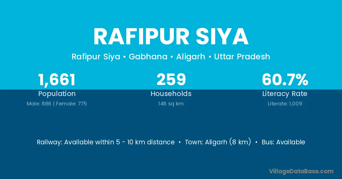 Aligarh (8 km) is the nearest town to Rafipur Siya village for major economic activities and is located approximately 8 km away.