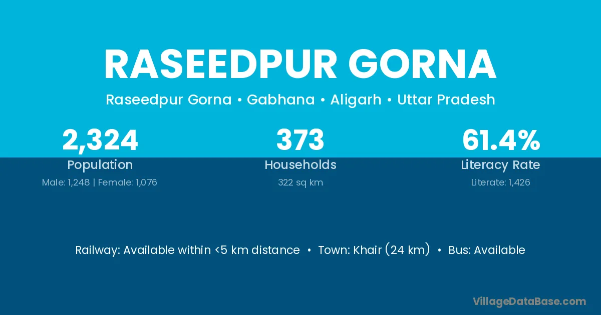 Khair (24 km) is the nearest town to Raseedpur Gorna village for major economic activities and is located approximately 24 km away.
