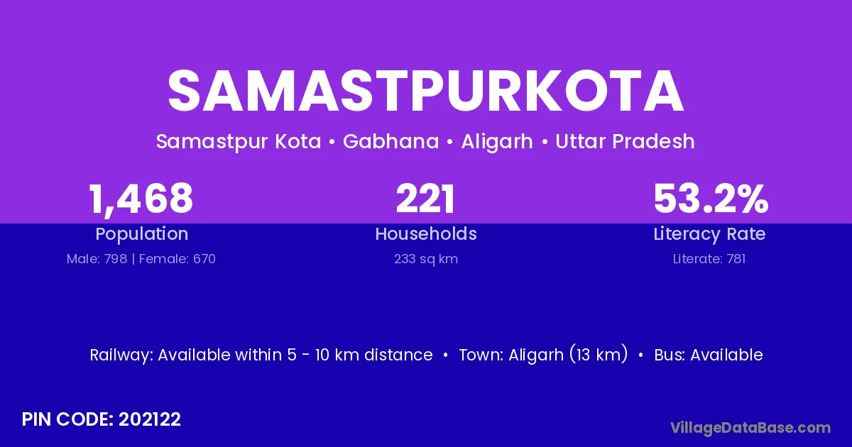 Aligarh (13 km) is the nearest town to Samastpurkota village for major economic activities and is located approximately 13 km away.
